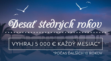 Predstavte si, že sa ďalších desať rokov nebudete musieť strachovať o peniaze. Teraz máte šancu vyhrať mesačnú rentu 5 000 € na najbližších 10 rokov! Jednoducho zotrite 3 rovnaké symboly a vyhrajte!